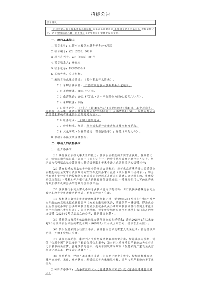仁怀市农村供水服务劳务外包项目