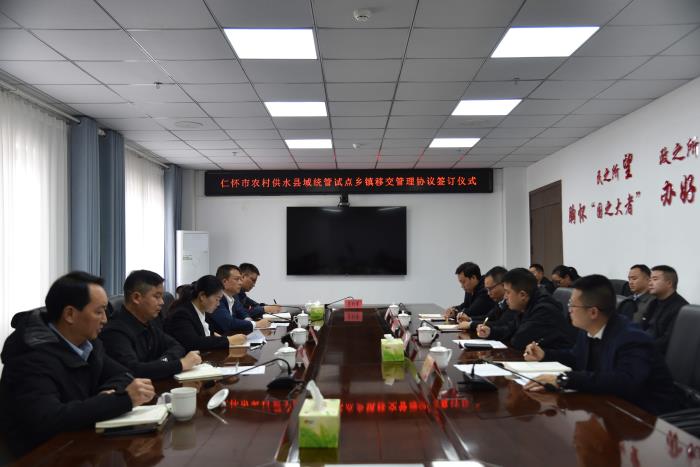 2025年12月31日,仁怀市农村供水县域统管试点乡镇移交管理协议签订仪式在仁怀市水务局举行。市政府副市长郑莹同志出席仪式并讲话,市水务局、市水投公司和试点乡镇相关负责人参加。